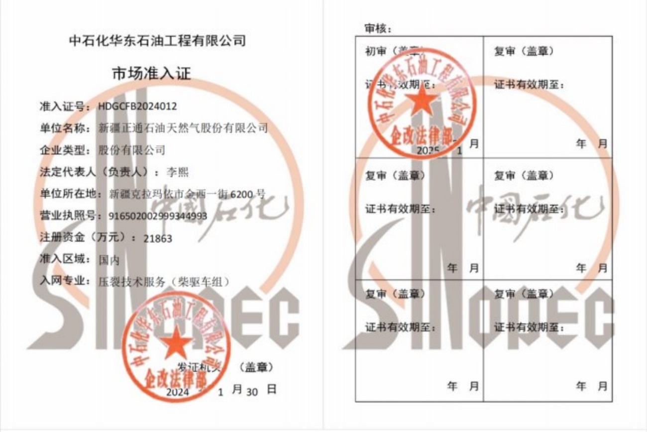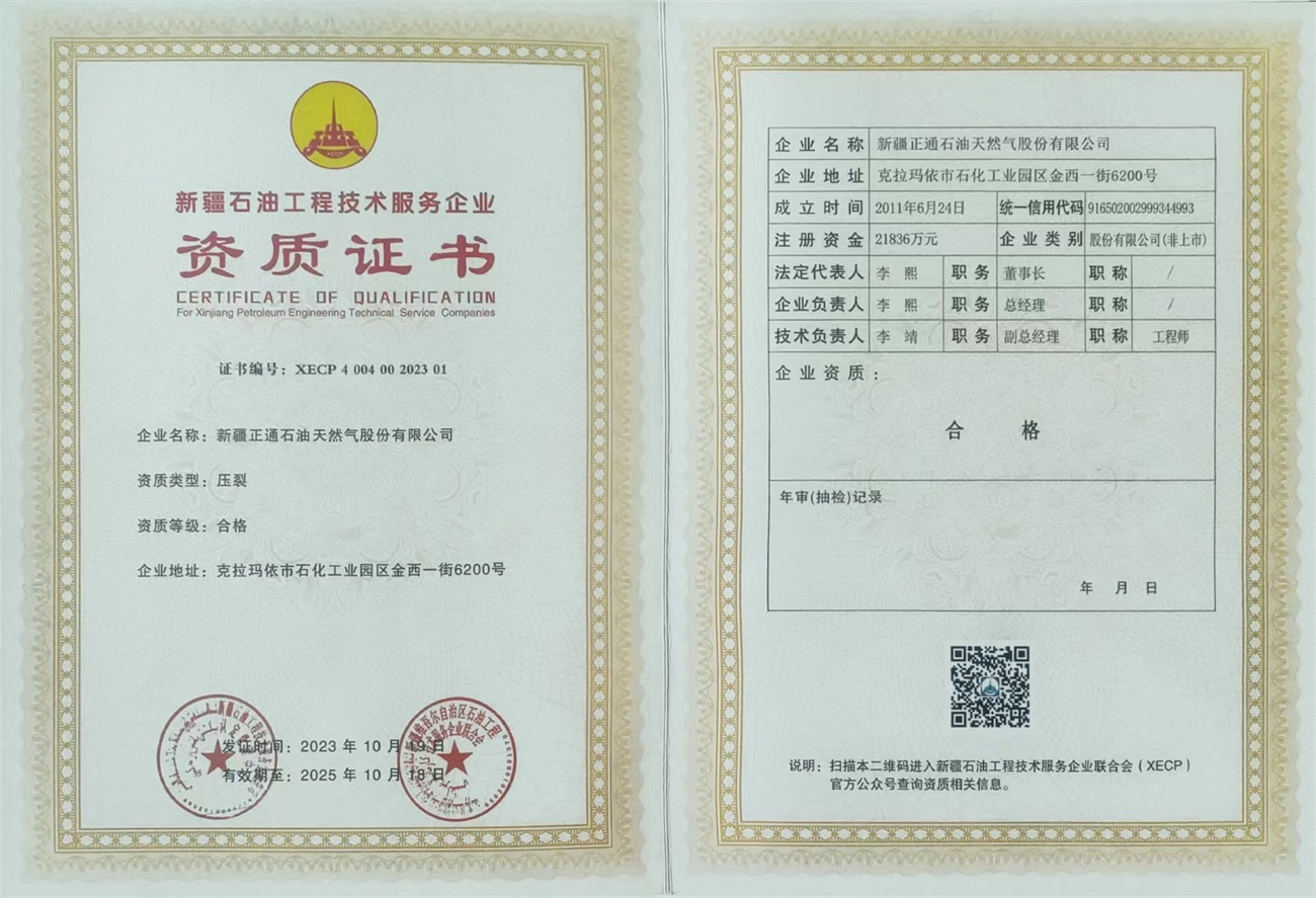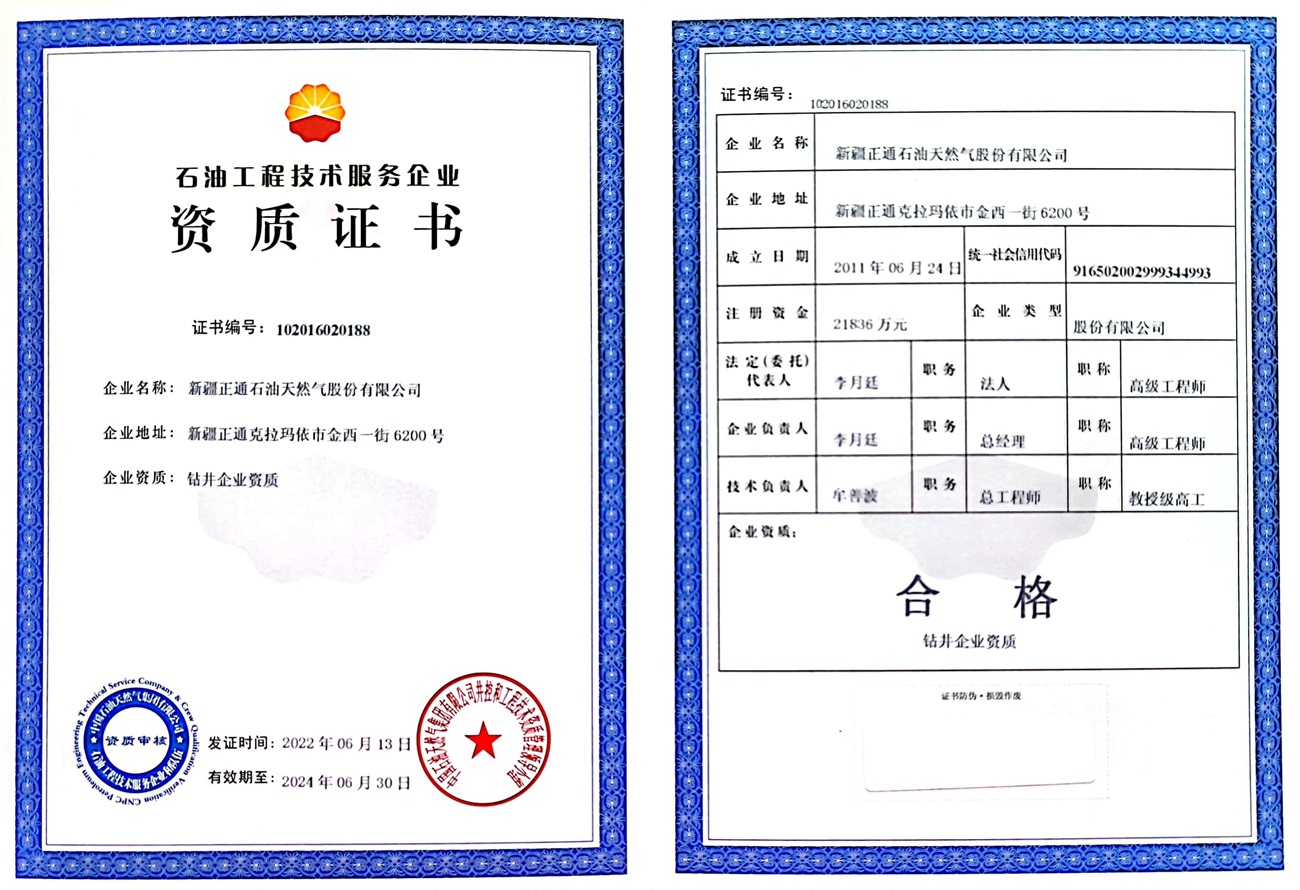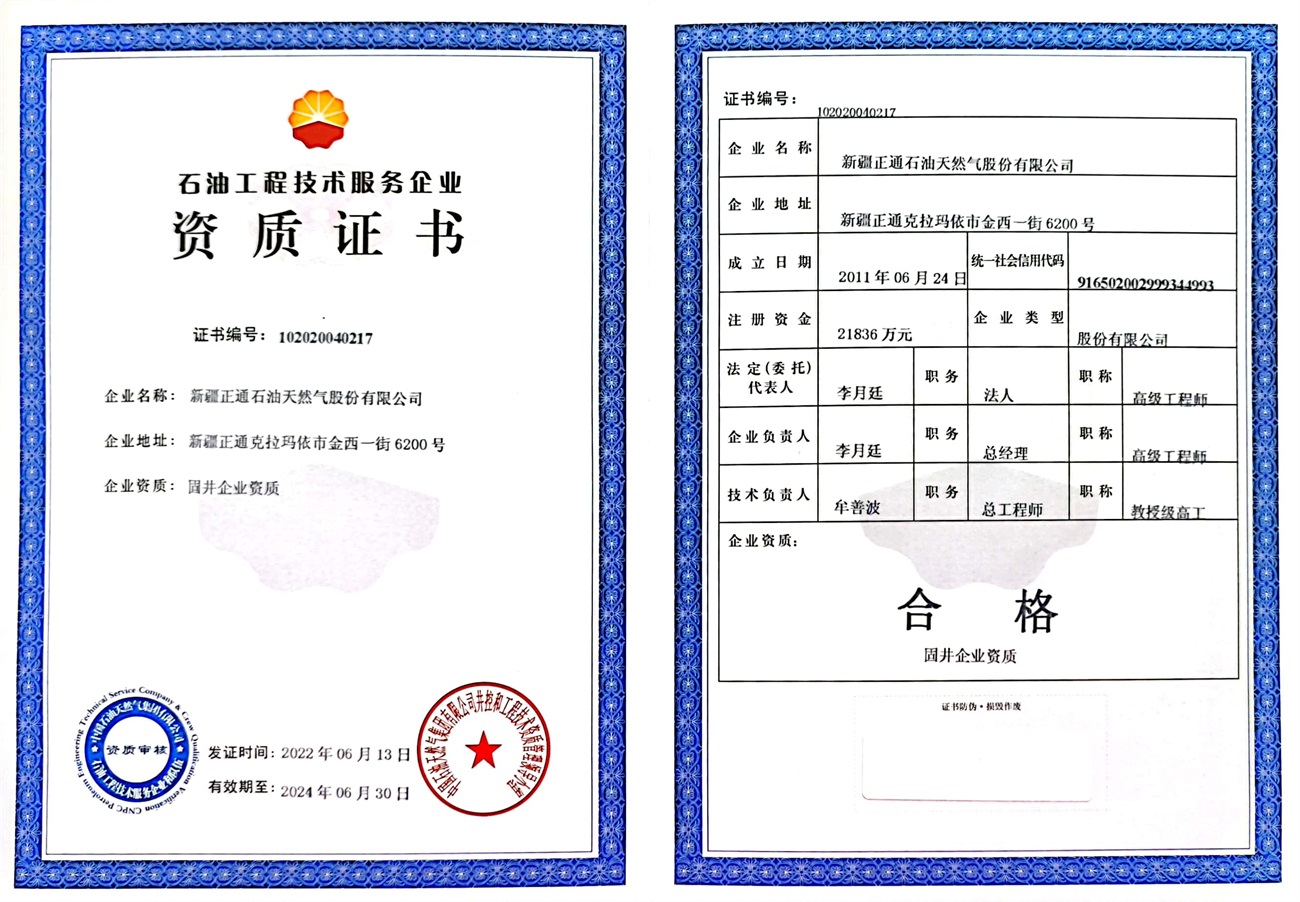 Zhengtong Oil & Gas is a national high-tech enterprise, a member of the International Association of Drilling Contractors (IADC), an autonomous region enterprise technology center, vice president of China Petroleum Technology Service Alliance (CPTSA), vice president of Xinjiang Petroleum Engineering Technology Service Enterprise Federation (XECP), and a loving enterprise for the disabled in Karamay City. The industry-education integration training base of Karamay Vocational and Technical College. It holds the qualification certificate for overseas contracted projects issued by the Ministry of Commerce of the People's Republic of China, and has obtained 35 patents. It also has an engineering technology research and development center, a test center and a fracturing technology research institute.