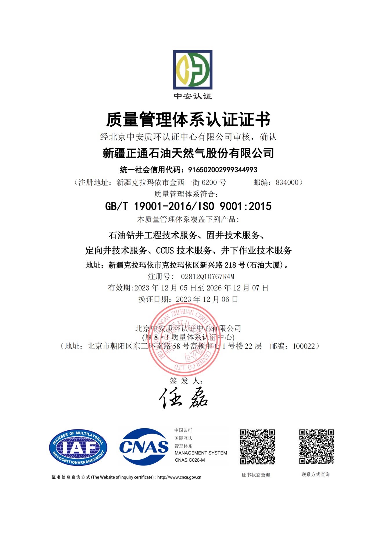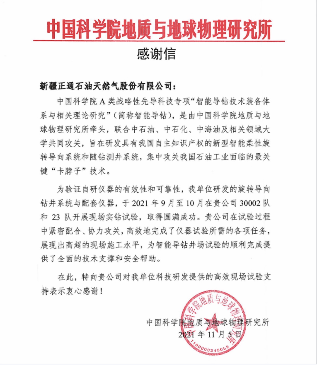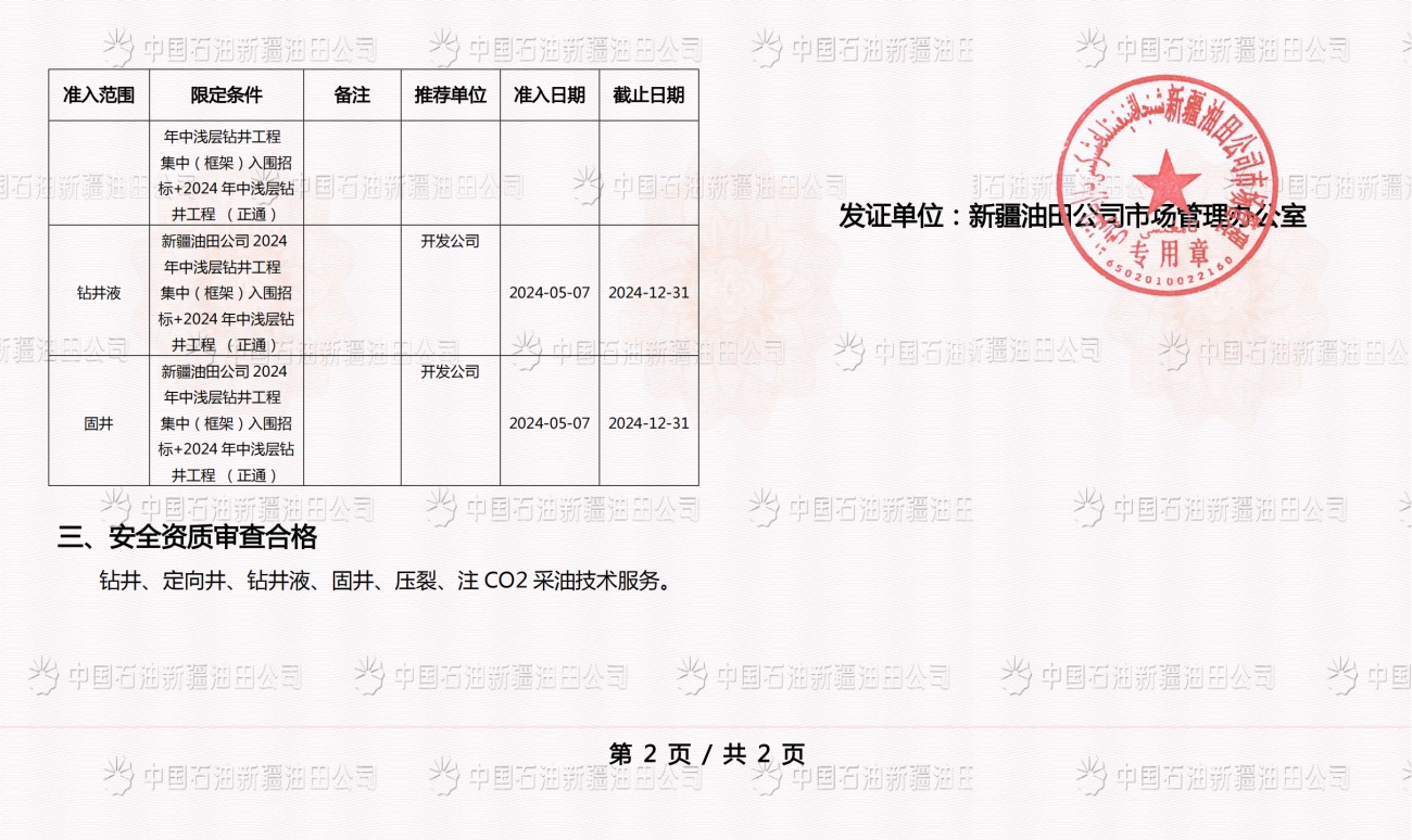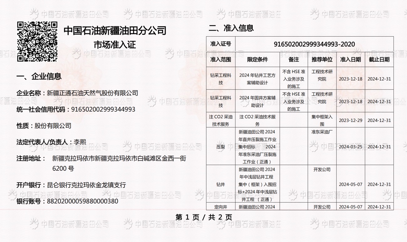 Zhengtong Oil & Gas is a national high-tech enterprise, a member of the International Association of Drilling Contractors (IADC), an autonomous region enterprise technology center, vice president of China Petroleum Technology Service Alliance (CPTSA), vice president of Xinjiang Petroleum Engineering Technology Service Enterprise Federation (XECP), and a loving enterprise for the disabled in Karamay City. The industry-education integration training base of Karamay Vocational and Technical College. It holds the qualification certificate for overseas contracted projects issued by the Ministry of Commerce of the People's Republic of China, and has obtained 35 patents. It also has an engineering technology research and development center, a test center and a fracturing technology research institute.